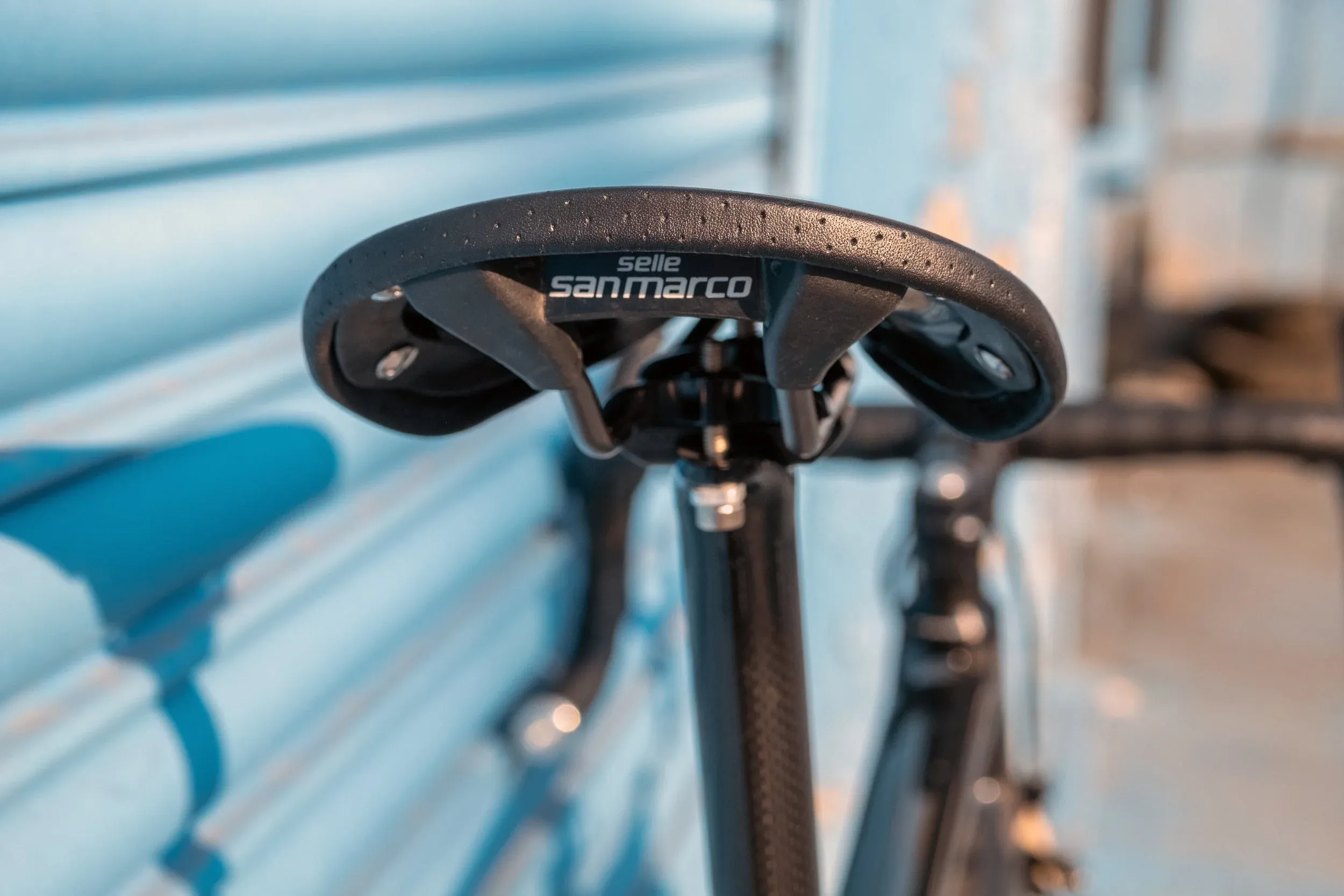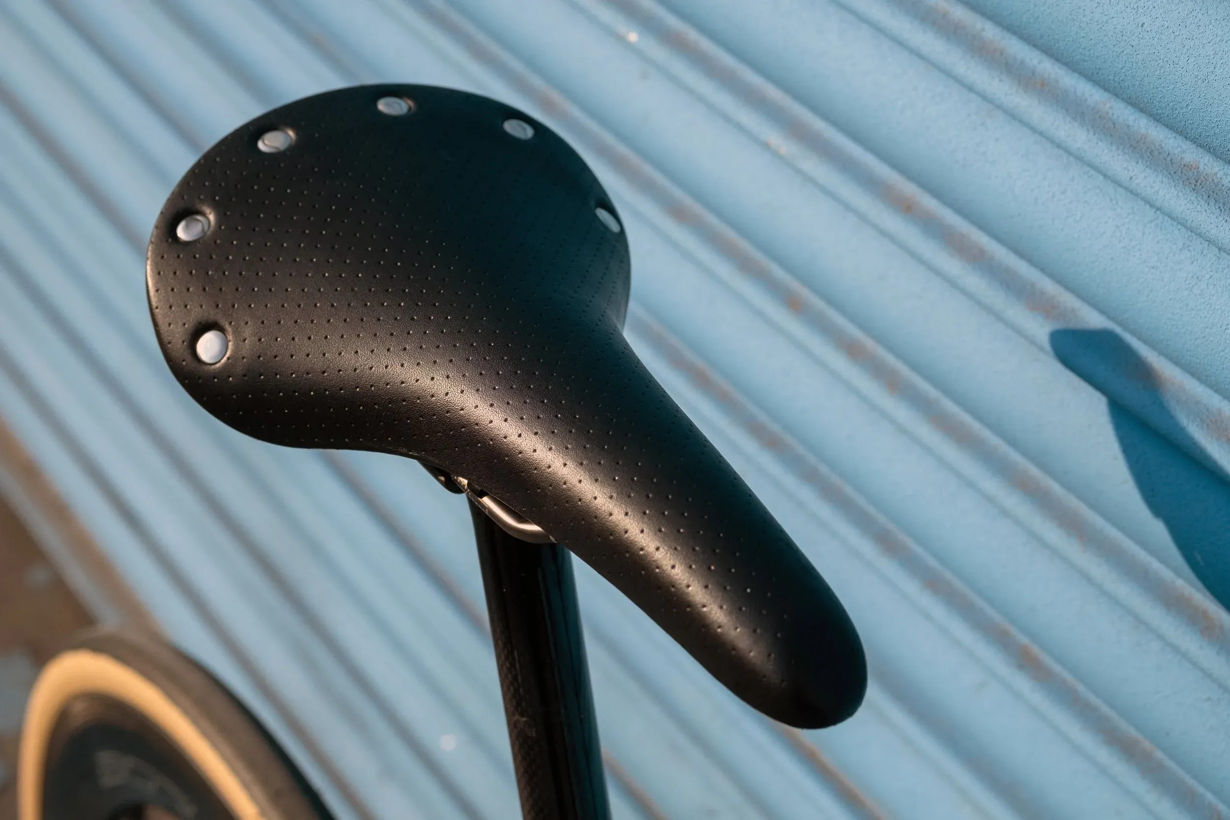 Saddle: San Marco Regal, custom wrapped in perforated leather with chrome rivets by Kontour.cc. Matches the perforated leather bar tape. It is heavy for a lightweight climbing bike. I do not care. Classic saddles are beautiful, and I am happy to carry the weight penalty.