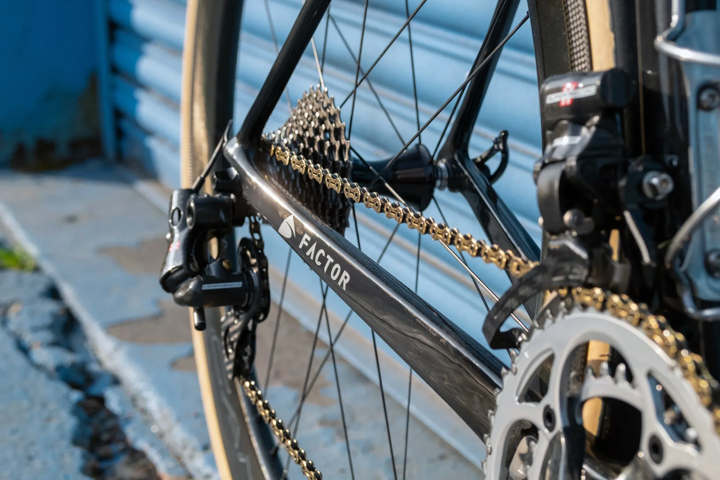 The Campagnolo Record chain is faster and more durable. I chose the KMC for the gold, to offset the silver detailing. Fast enough. Light enough. It has my process: strip in a sonic cleaner with Muc-Off Drivetrain Cleaner, then apply Ludicrous AF Chain Lube.