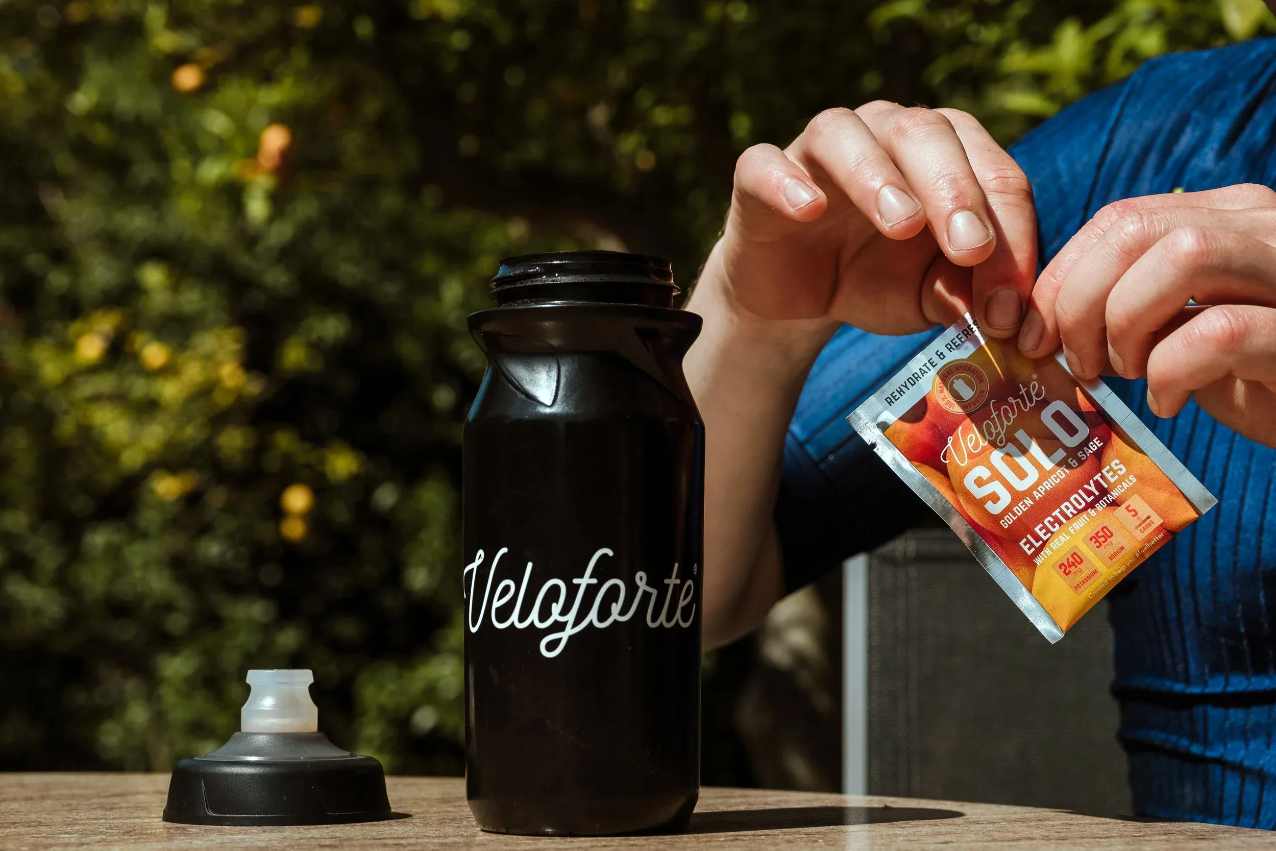 SOLO Electrolyte Powder: Hot conditions and consecutive riding days drain sodium and potassium fast. SOLO replenishes them: powdered coconut water, pink Himalayan salt, 240mg potassium, 350mg sodium, 5g carbs. The flavour is refreshing enough that you actually want to drink more, which is the point.
