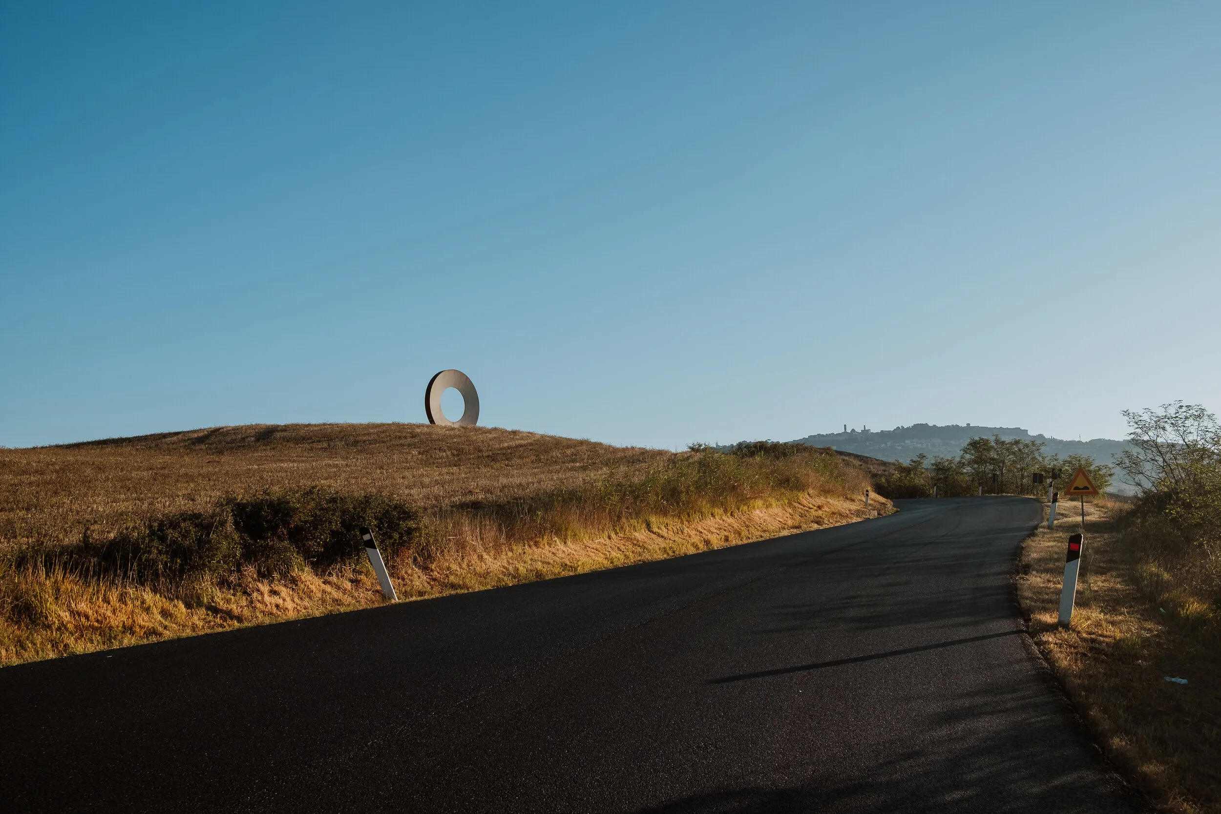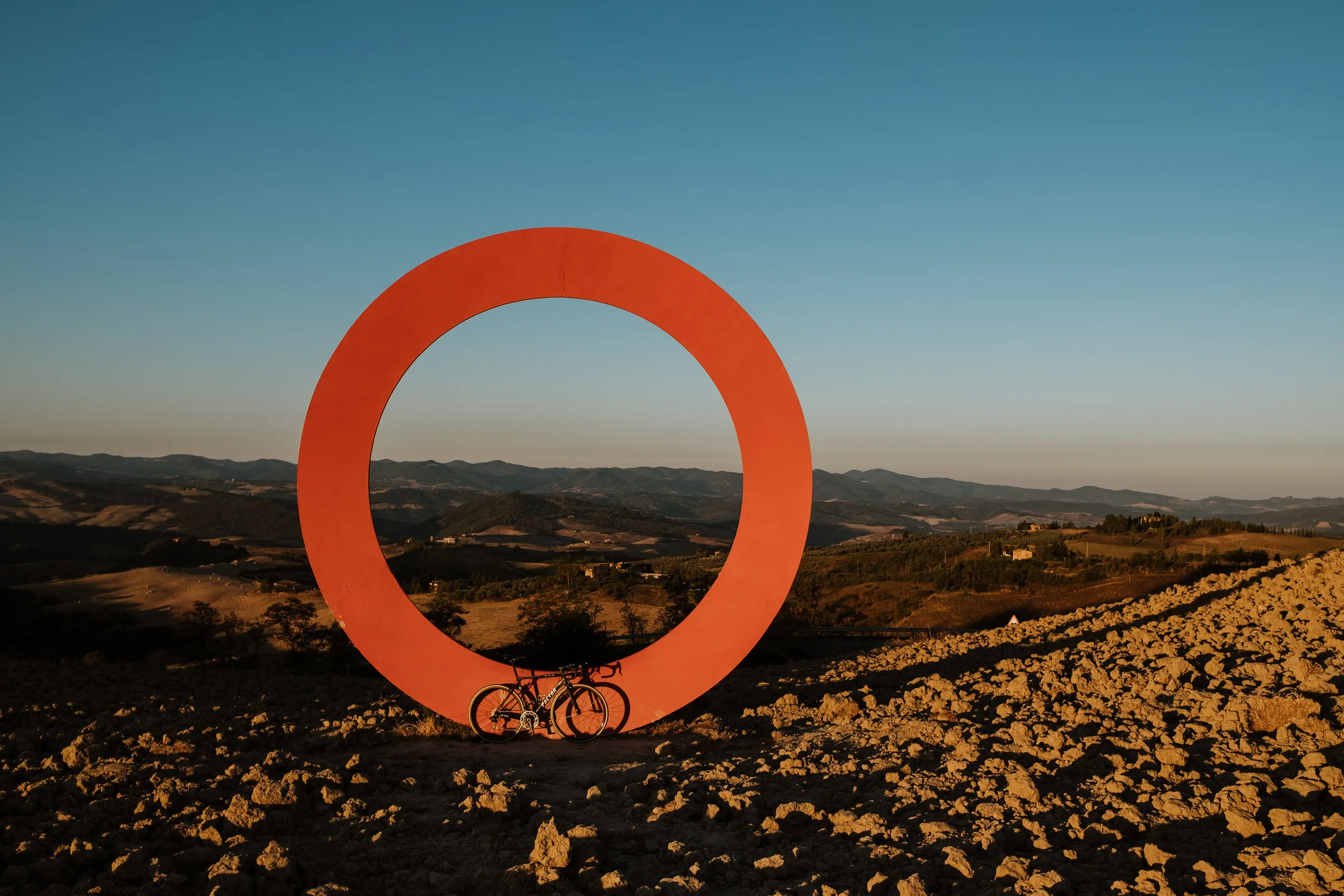 On the road home, I found one of Mario Staccioli’s sculptures from his series “Luoghi d’Esperienza” (places of experience): a geometric frame, large, red, inviting you to stop and look at the landscape through the circle it described.