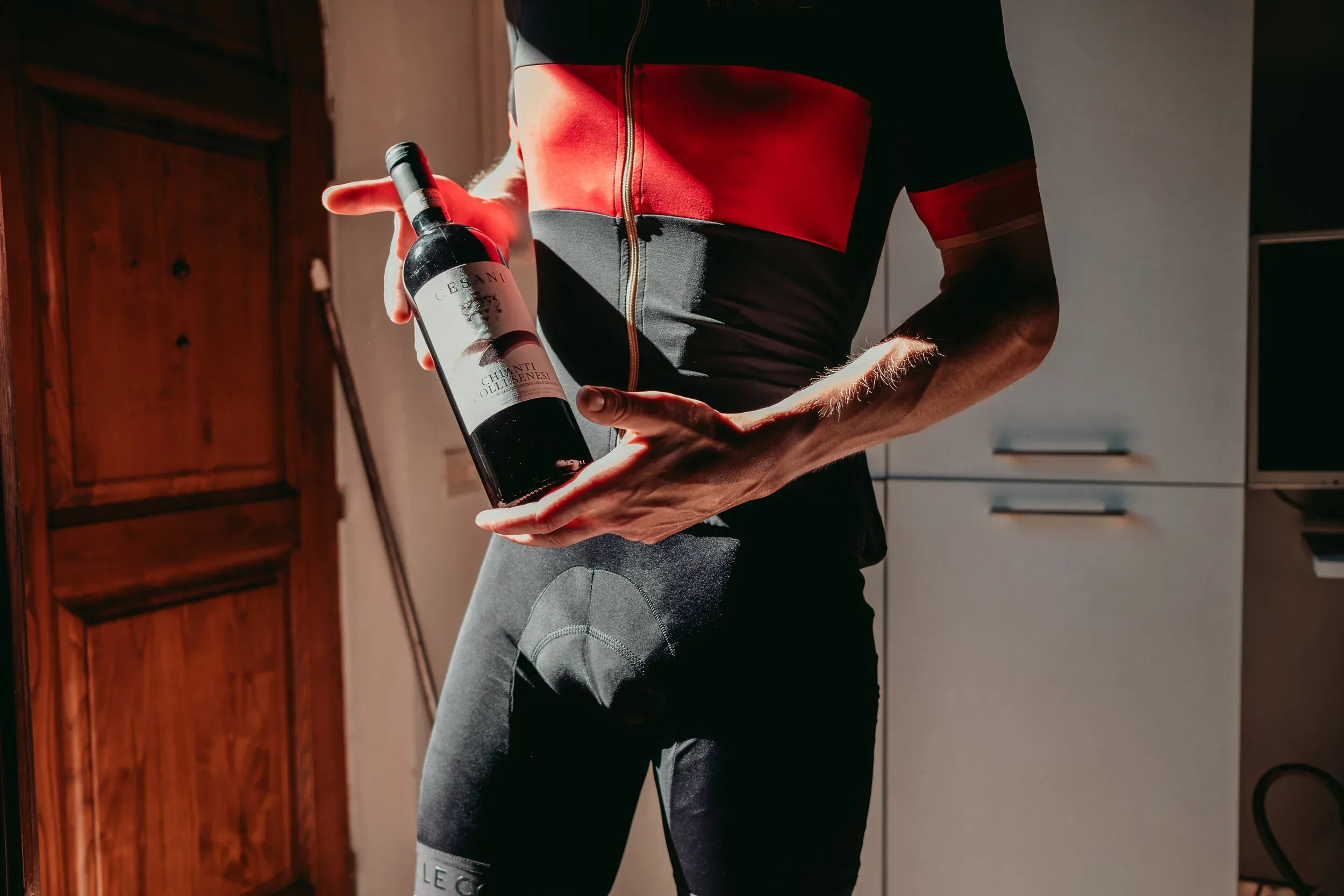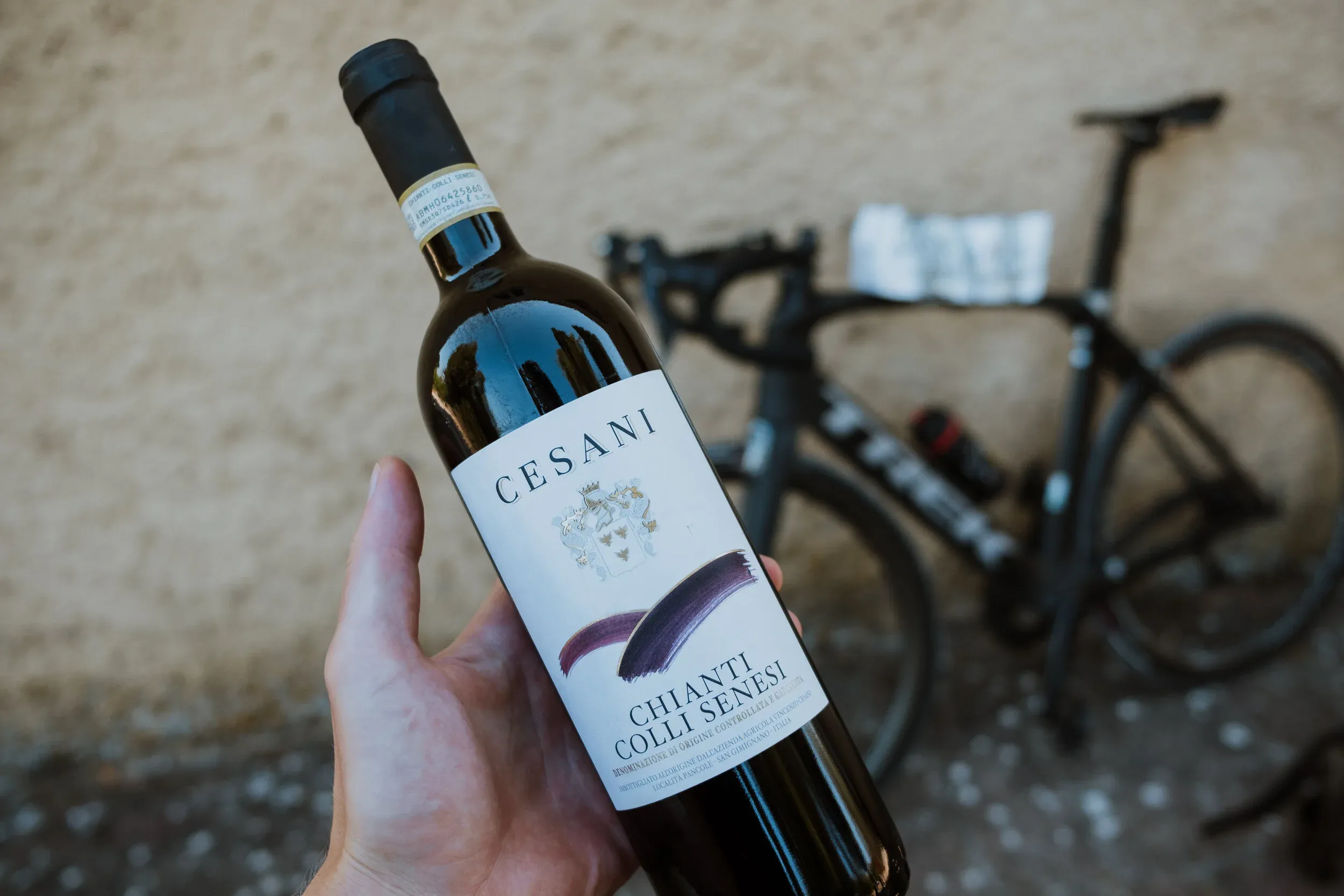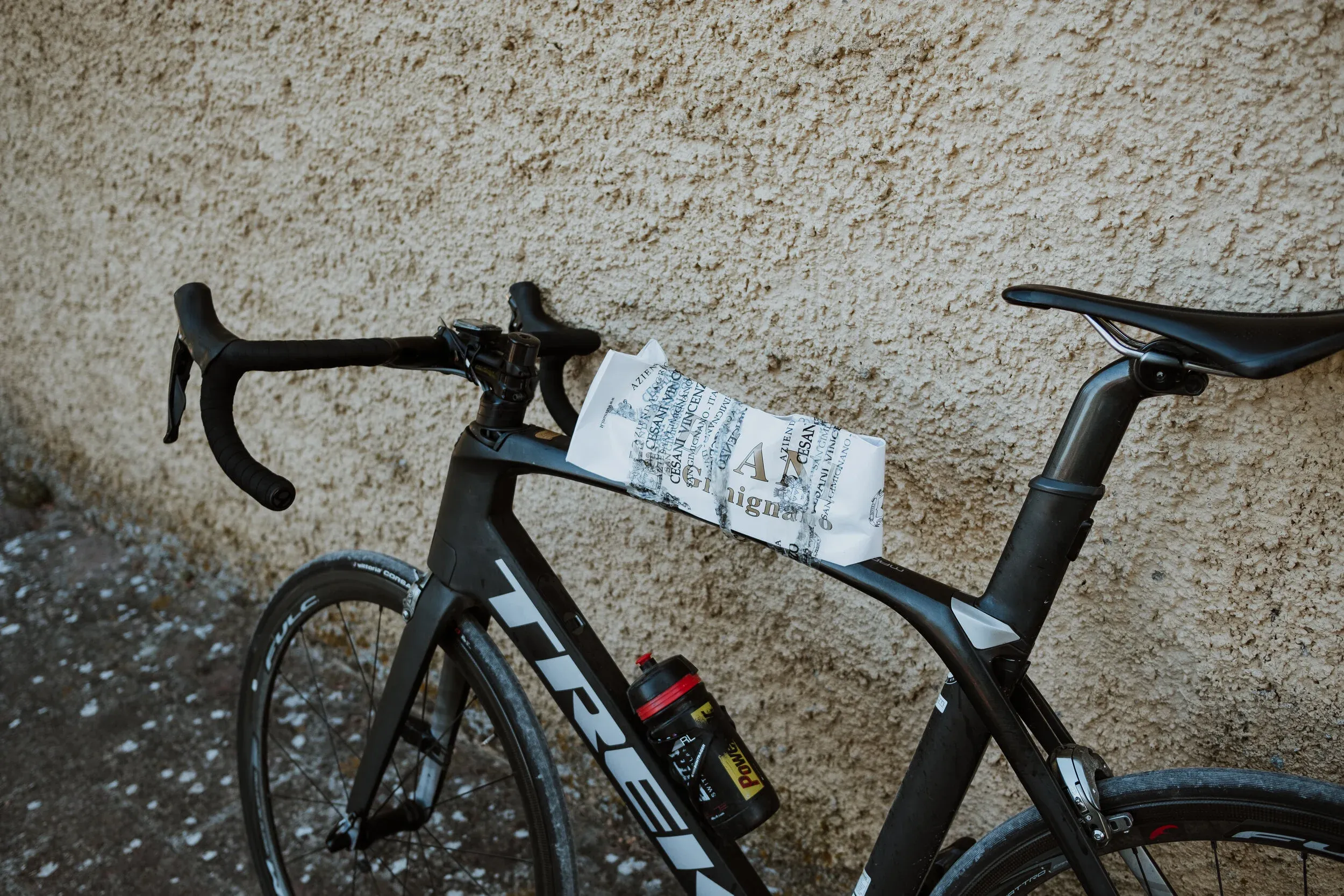 The problem: Gabriele’s pockets were too short to carry a wine bottle safely. His solution: tape it to the top tube.