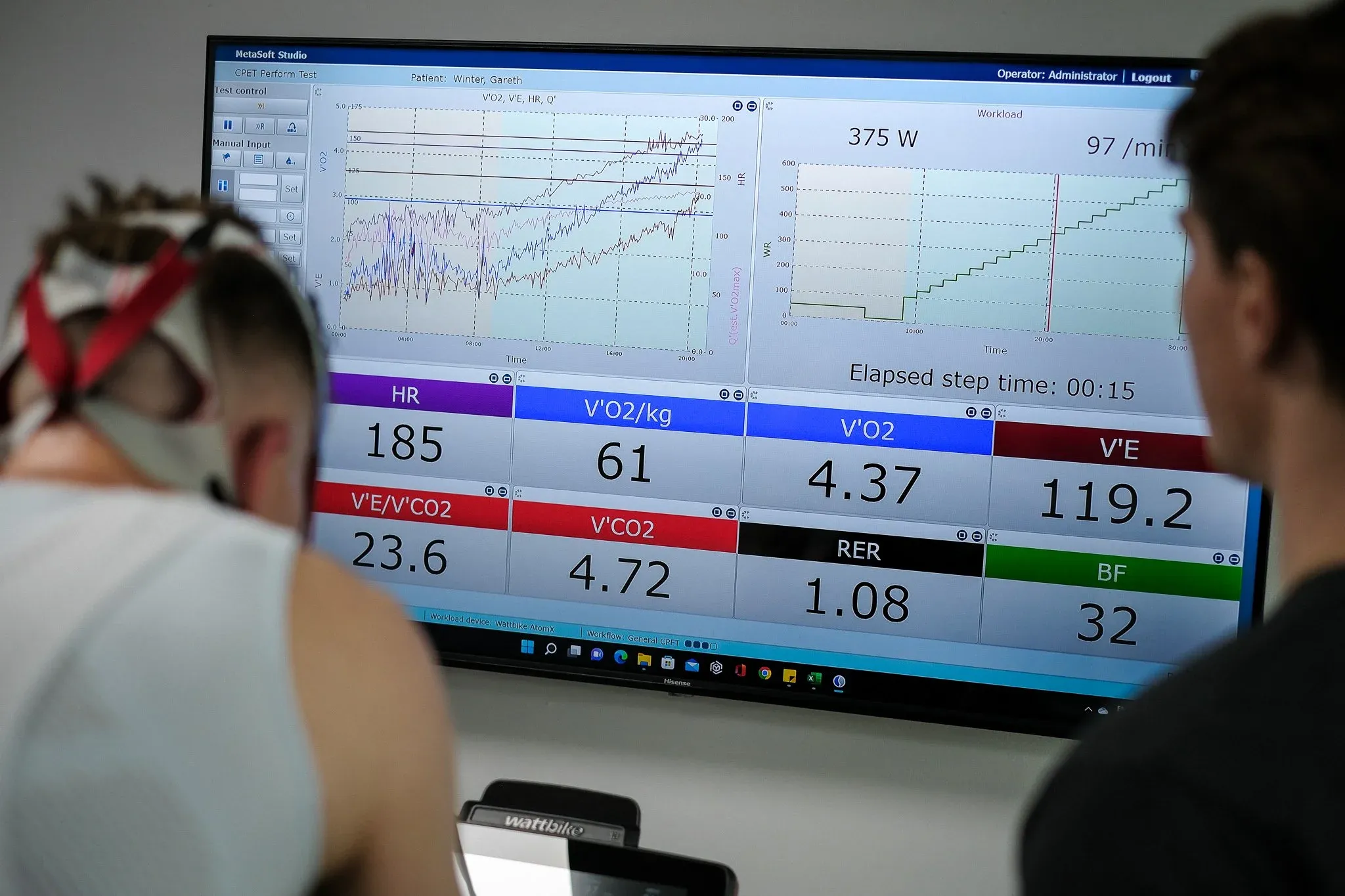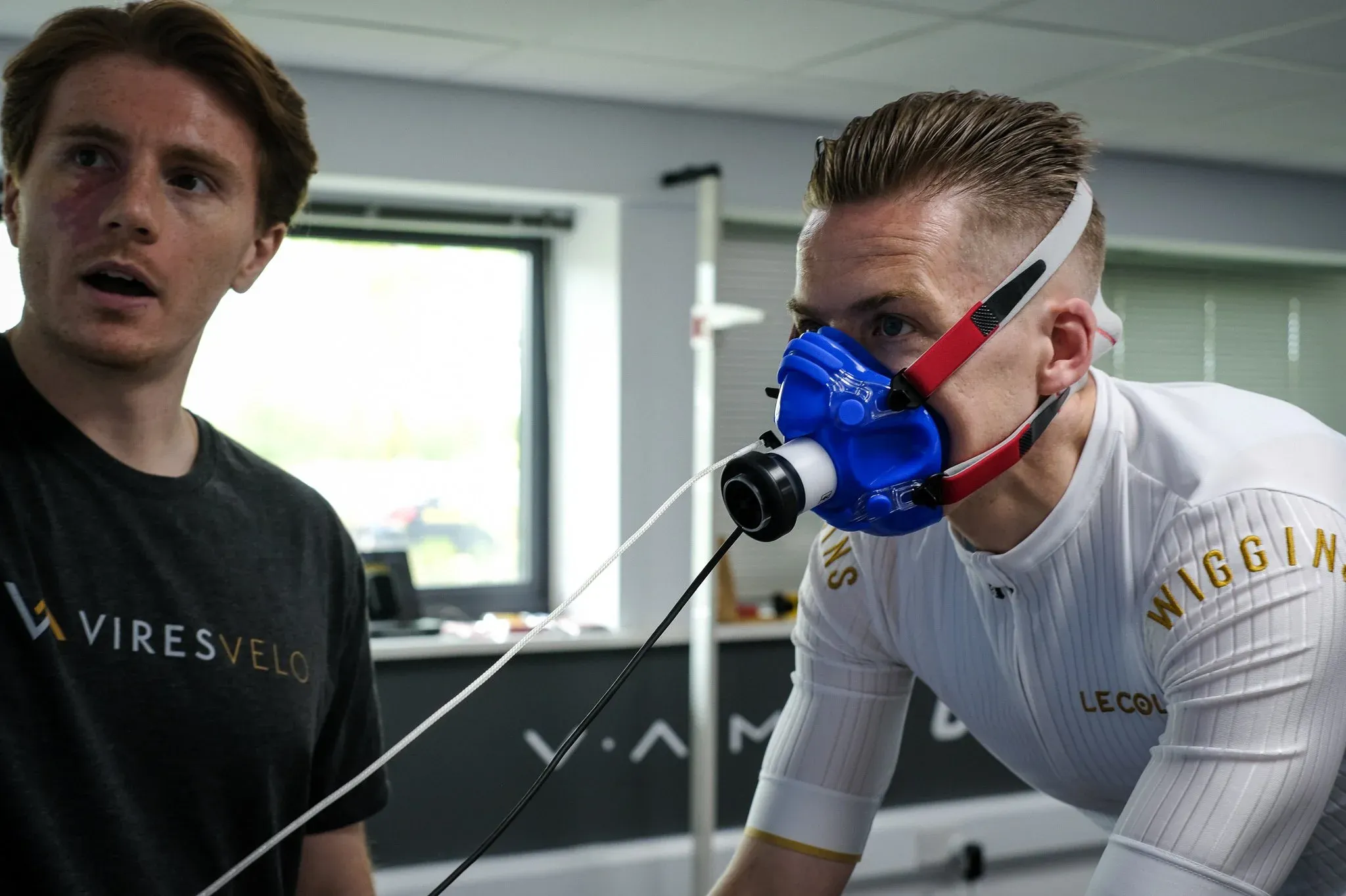The ramp test itself: the mask restricts your breathing, the power climbs, your core temperature rises, and at some point you are simply gasping. Hayden talked me through each stage and made sure I got my best effort out.